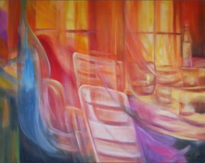 The painter's abstract and imaginary oil paintings arise from her imagination and creativity.